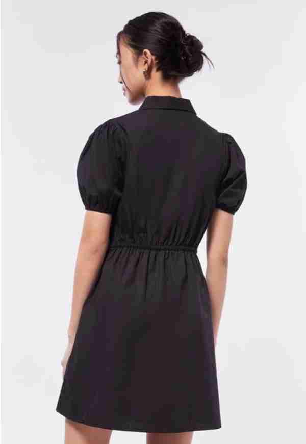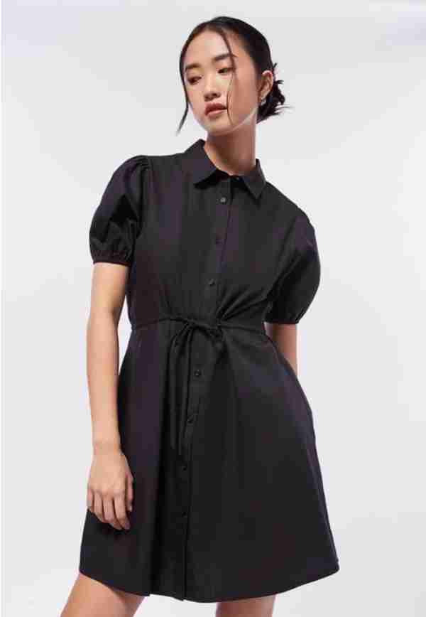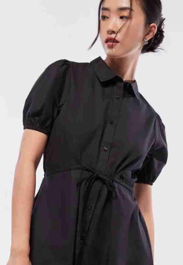 Dress ini menggabungkan desain mini shirt dress yang simpel dengan detail lengan balon yang menambah kesan playful dan stylish.